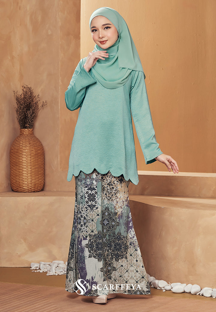 Material:Tops: Luxe Textured SatinSkirt: Pemium Indonesian Cotton BatikTop:- Mini Kurung with scallop- Round neck with wrap button-...