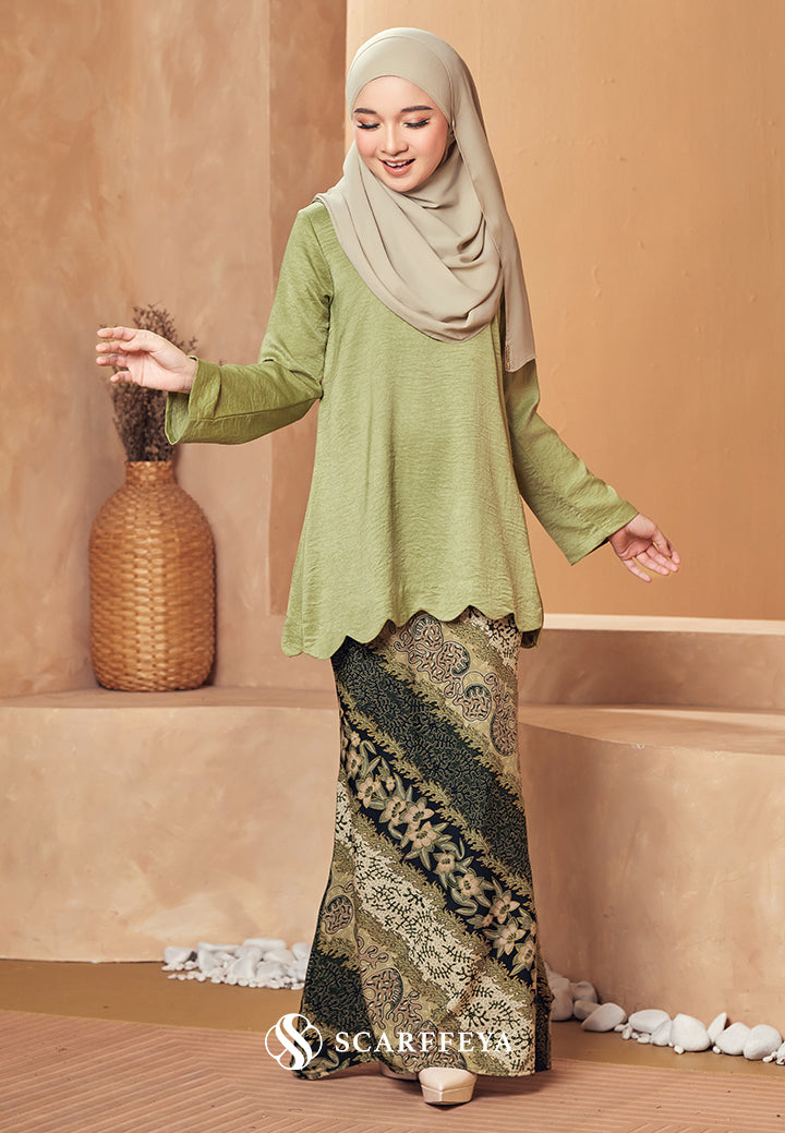 Material:Tops: Luxe Textured SatinSkirt: Pemium Indonesian Cotton BatikTop:- Mini Kurung with scallop- Round neck with wrap button-...