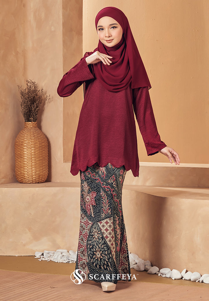 Material:Tops: Luxe Textured SatinSkirt: Pemium Indonesian Cotton BatikTop:- Mini Kurung with scallop- Round neck with wrap button-...