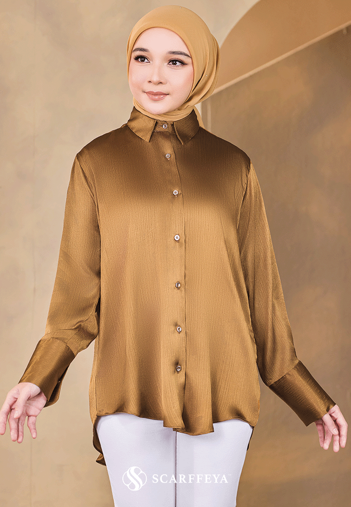 EVA EXECUTIVE BLOUSE • ⁠Material: Jacquard Wrinkle Satin• Wudhu' friendly• ⁠Point Collar• ⁠Cuff gold button• ⁠Full front...